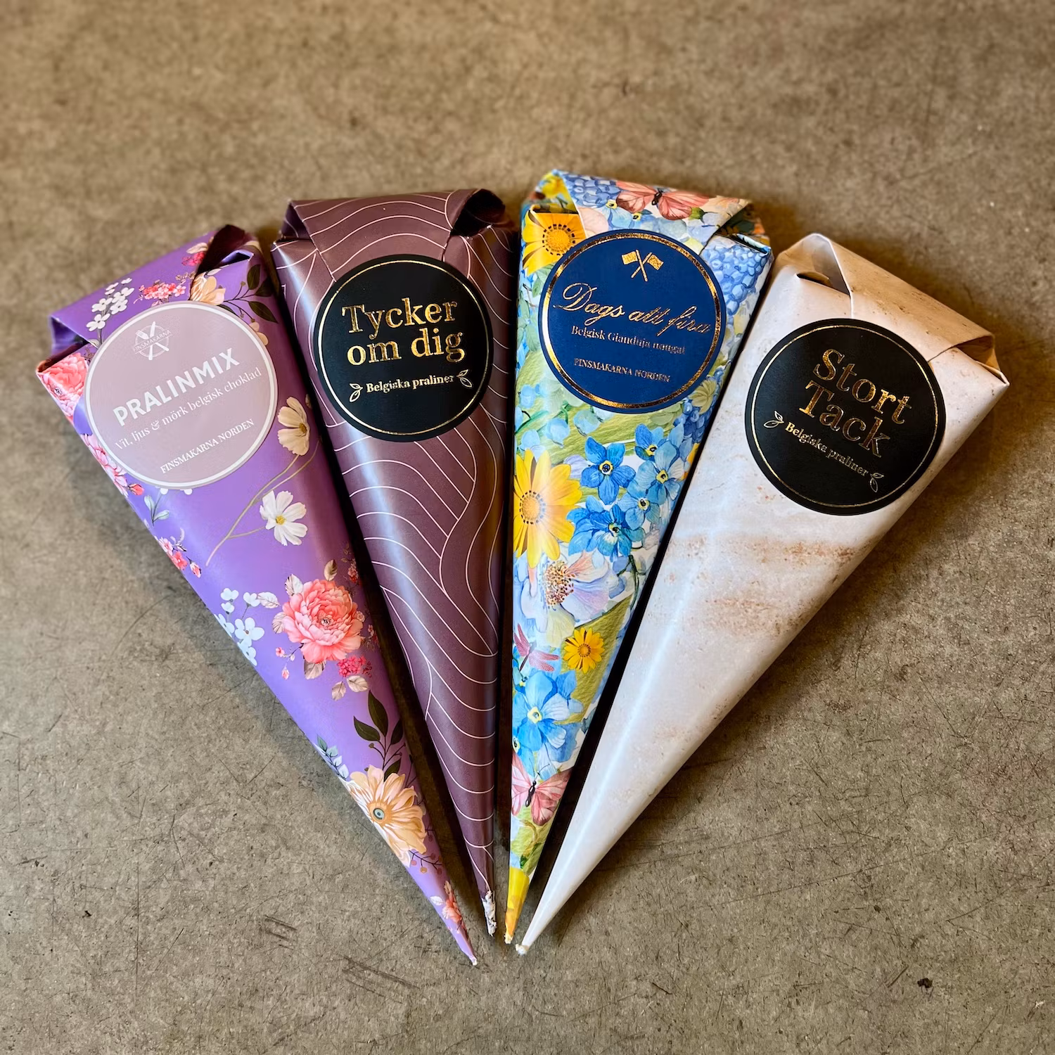 God choklad av fin kvalitet i strut. Vi väljer en passande strut till just din bukett.